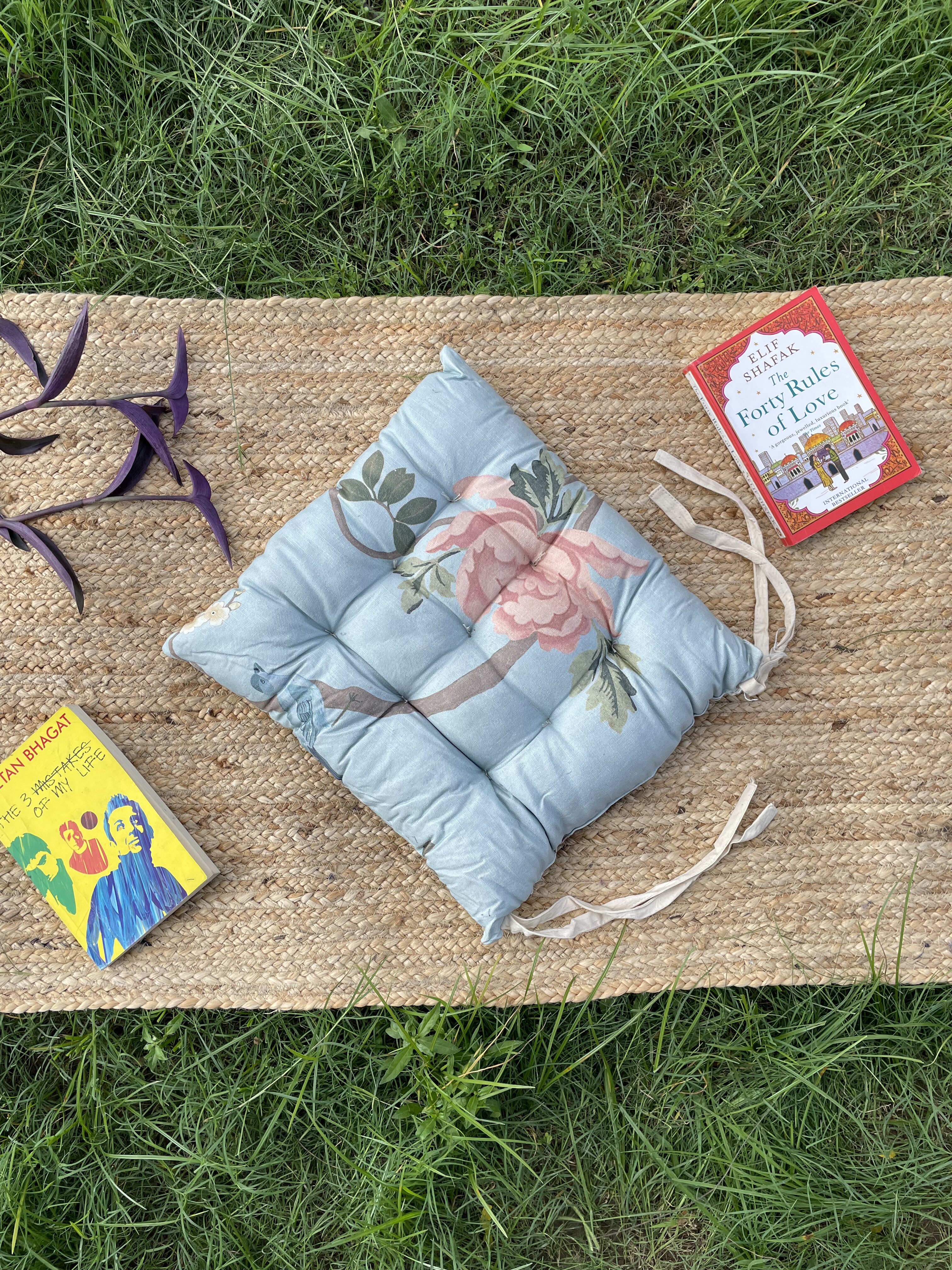 Upcycled Pastel blue with floral print chair pad | 15 x 15 inches | Seat Cushion for Dining, Office & Car