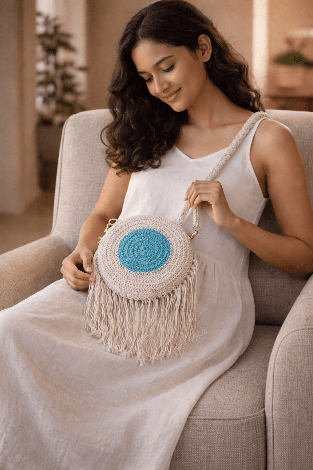 Designed for relaxed everyday use, the Circular Crochet Sling Bag with Teal Accent by Respun combines neutral cotton tones with a bold woven centre. The fringe detailing adds texture and movement, while the compact shape ensures easy carrying. Ideal for travel, markets, or casual walks, this sling bag offers functionality wrapped in artisanal design.