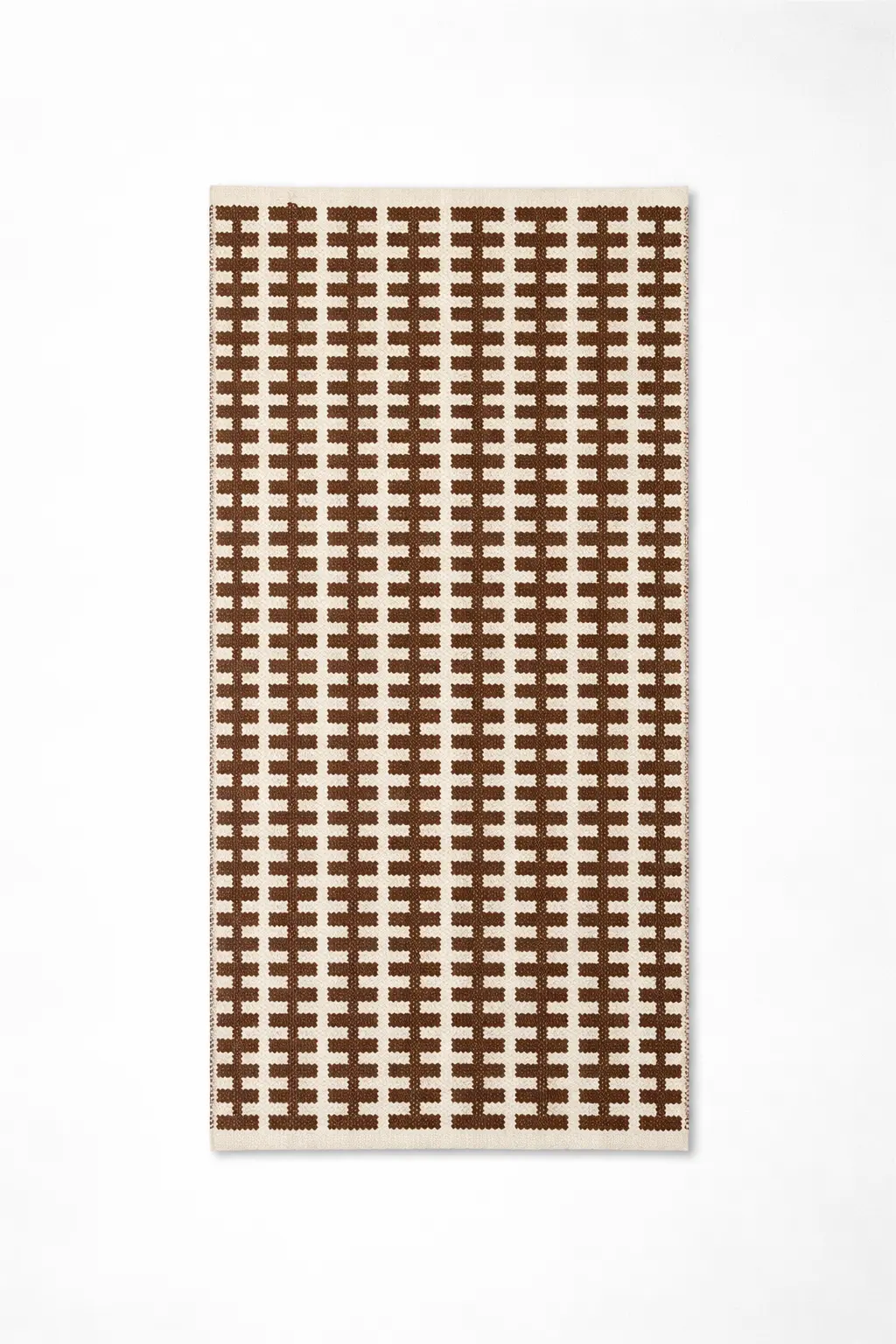 Bring character and conscious design into your home with this handwoven cotton rug by Respun. Featuring a striking brown and white geometric pattern, this rug blends contemporary aesthetics with traditional weaving techniques.