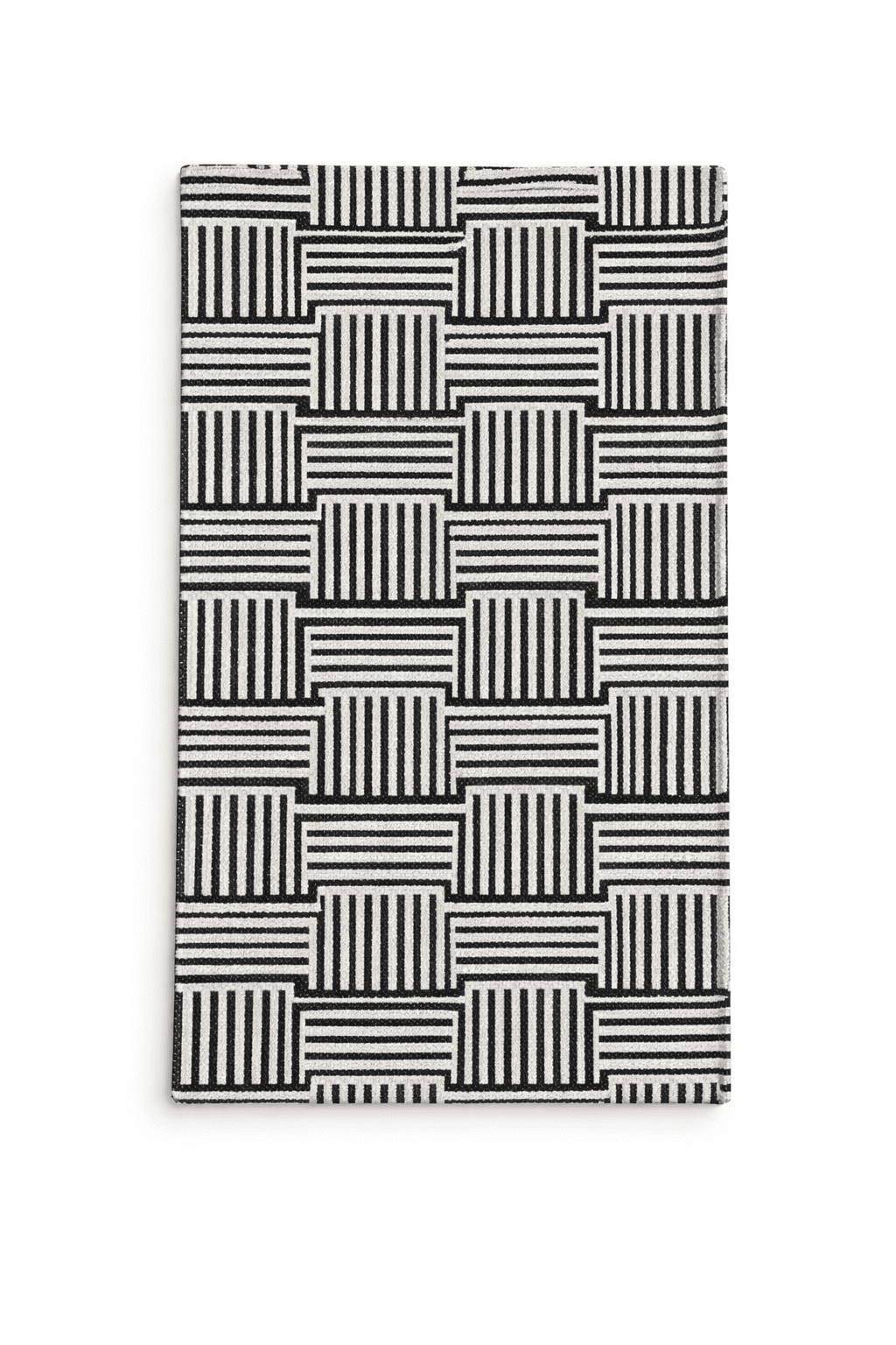 Bring depth and conscious design into your living spaces with this handwoven cotton floor mat by Respun. Featuring a bold black and grey geometric pattern, this mat blends modern aesthetics with traditional flat-weave craftsmanship.