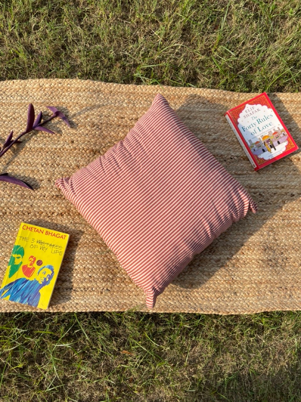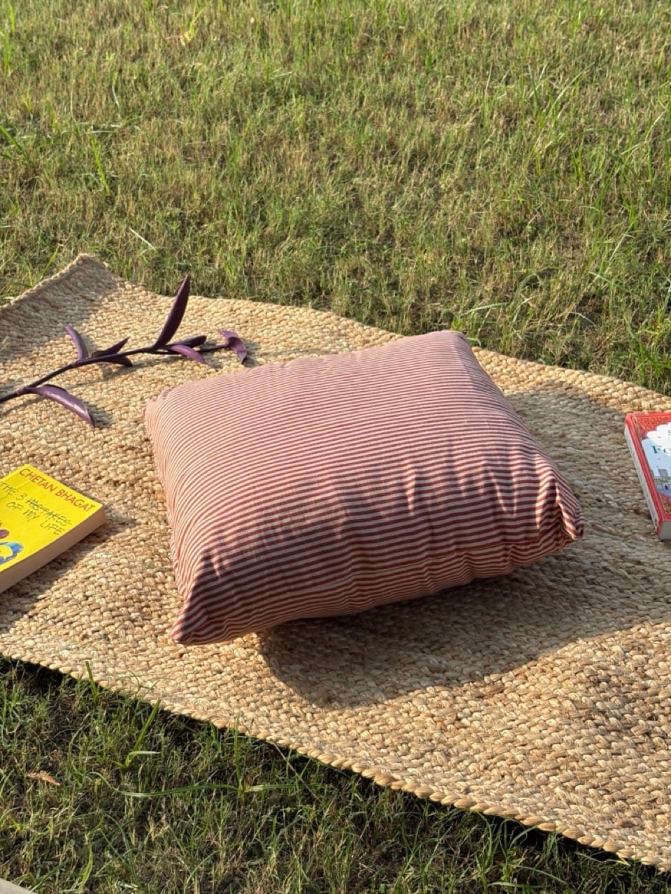 With its red and white striped finish, this cushion is one-of-a-kind, adding both comfort and character to your space. Choosing this sustainable cushion means supporting artisan livelihoods while embracing eco-friendly living.